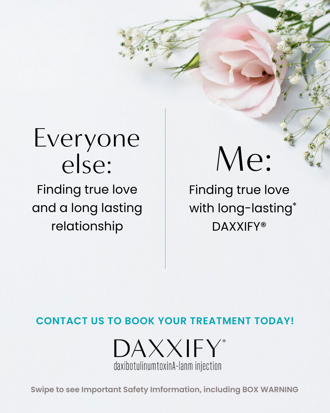The effects of DAXXIFY® and all botulinum toxin products may spread from the area of injection to produce symptoms consistent with botulinum toxin effects. These symptoms have been reported hours to weeks after injection. Swallowing and breathing difficulties can be life threatening and there have been reports of death. DAXXIFY® is not approved for the treatment of spasticity or any conditions other than cervical dystonia and glabellar lines.