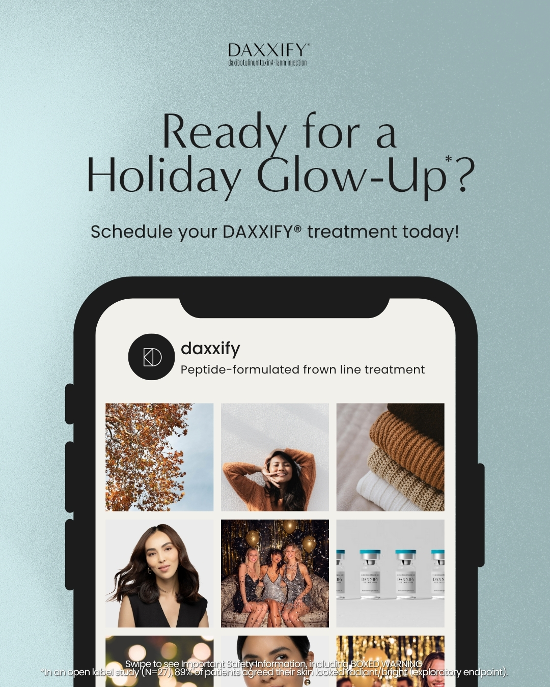 The effects of DAXXIFY® and all botulinum toxin products may spread from the area of injection to produce symptoms consistent with botulinum toxin effects. These symptoms have been reported hours to weeks after injection. Swallowing and breathing difficulties can be life threatening and there have been reports of death. DAXXIFY® is not approved for the treatment of spasticity or any conditions other than cervical dystonia and glabellar lines.